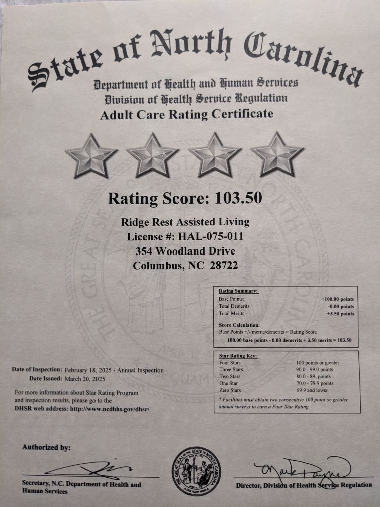 Recognized state wide for excellence in resident care, safety, and facility management, reflecting our commitment to quality.